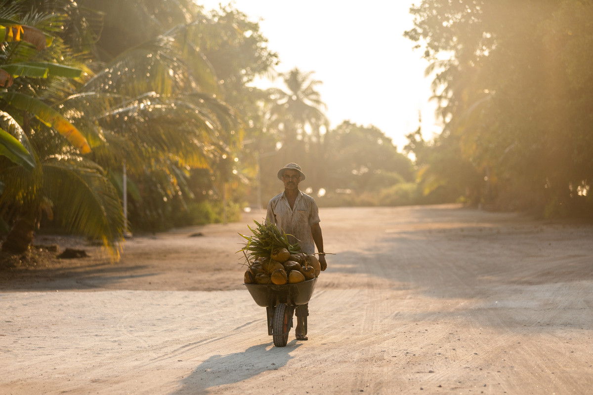 Tief in der Kultur verwurzelt, ist «Ruh» der Nationalbaum der Malediven, wo die Menschen fast jeden Teil der Pflanze zu nutzen wissen. Generationen von Inselbewohnern leben im Rhythmus des Baumes, den sie umgibt – sie prägen das Landschaftsbild. So beobachtet man staunend, wie Kokosnusspflücker flink die dünnen, windgebogenen Stämme emporklettern, um an die smaragdgrünen bis tigeraugenbraunen Früchte zu gelangen. Denn schon die junge Kurumba-Kokosnuss dient als Durstlöscher. Reich an Elektrolyten ist ihr Saft eine willkommene Erfrischung in den tropischen Breitengraden. Wer nicht schlürfen mag, löffelt ihr weiches Fruchtfleisch aus.