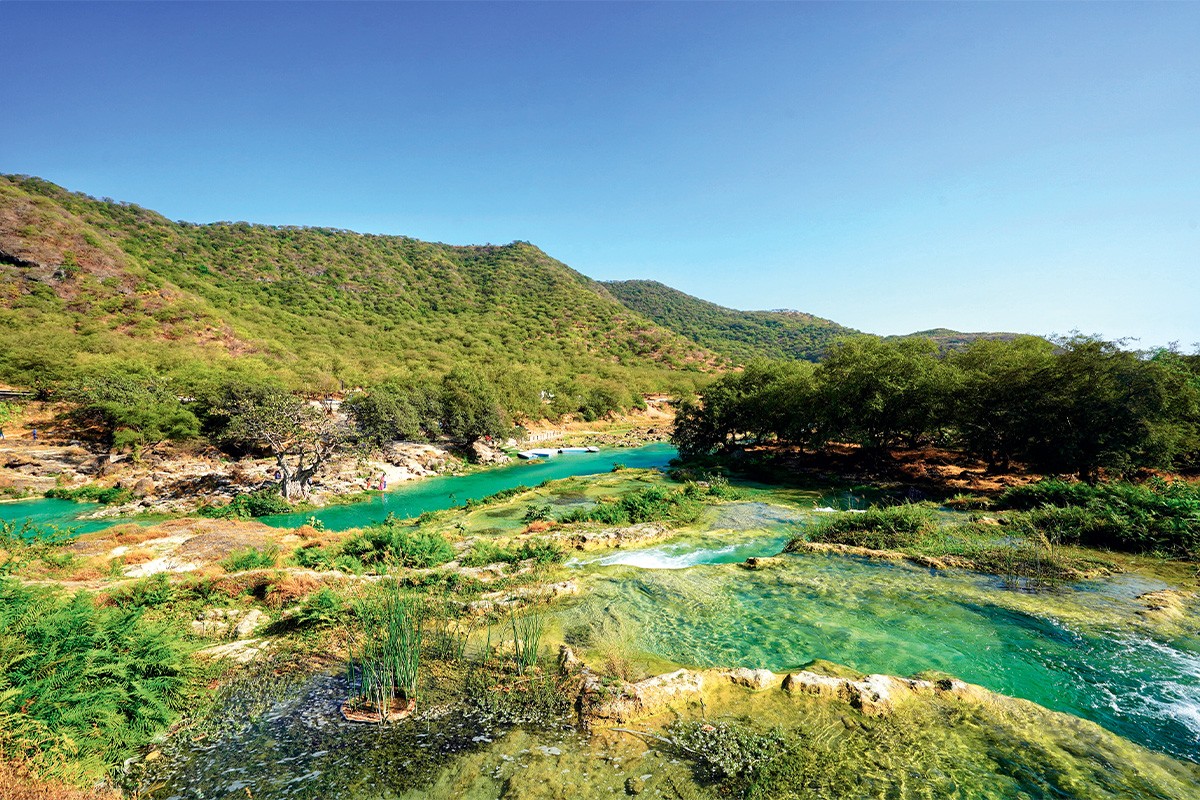 Ebenfalls zum UNESCO-Weltkulturerbe zählen das trockene Tal Wadi Dawkah, zusammen mit antiken Häfen und der sagenumwobenen Weihrauchstrasse in der Region Dhofar mit dem Hauptort Salalah, deren Küstenlandschaft die Kargheit anderer Gefilde krass kontrastiert. Hier, wo sich saisonal der Monsun ergiesst, «Khareef» genannt, verliert das Terrain seine steinerne Strenge und erscheint feuchter, fruchtbarer, fast schon tropisch – Dschungelgrün übertüncht das Wüstengelb, windschiefe Palmen säumen kilometerlange kokosraspelweisse Strände, auf Plantagen reift eine exotische Ernte von Bananen bis Papayas heran.