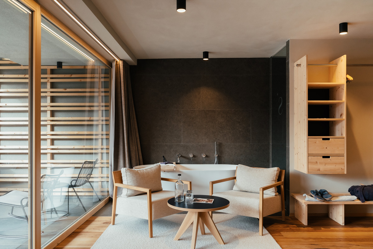 Sehr viele. Besonders stark zeigt sich meine Handschrift in jenen Bereichen, in denen Stille und Emotion miteinander in Dialog treten. Im Innenhof etwa, wo Licht und Schatten eigene Geschichten erzählen und die Atmosphäre fast meditativ wirkt. Oder im Badehaus, das wie ein Rückzugsort in sich selbst gebaut ist. Es ist ein Raum, der Menschen einlädt, langsamer zu werden, zu reflektieren und ganz in sich zu kehren. Auch die Südtiroler Bergfichte, die wir bewusst als warmes, geerdetes Element eingesetzt haben, trägt viel von meiner Ästhetik: Natürlichkeit, Ruhe, Tiefe. Dazu kommen Stoffe, die man fühlen möchte, Farbwelten, die die Seele entschleunigen, und Kunst, die Räume subtil auflädt und ihnen eine zusätzliche Dimension verleiht. Ich liebe Licht, das nicht einfach beleuchtet, sondern umarmt, und Architektur, die Raum gibt, statt ihn zu dominieren. Meine Handschrift zeigt sich überall dort, wo Intuition, Ästhetik, Natur und Kunst still harmonieren.